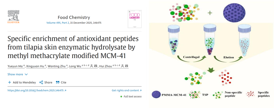 近日,我院褐藻加工综合高效利用及可持续发展团队在国际食品Top期刊Food Chemistry(Q1,IF= 9.8)公开发表题为“Specific enrichment of antioxidant peptides from tilapia skin enzymatic hydrolysate by methyl methacrylate modified MCM-41”的学术论文。论文第一作者为我院2023届硕士研究生马月云(现为集美大学博士研究生),通讯作者为周慧副教授和武龙教授。
