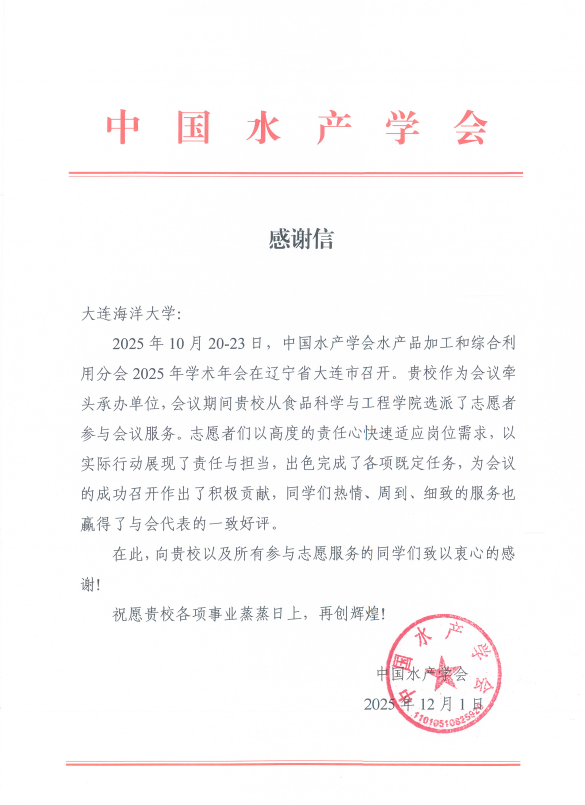 10月20日-23日,我校作为牵头单位,承办了中国水产学会水产品加工和综合利用分会2025年学术年会。近日,中国水产学会向我校发来感谢信,对食品科学与工程学院选派出的志愿者给予了高度评价。信中指出,志愿者们以实际行动展现出了青年责任与担当,为会议的成功召开作出了积极贡献。志愿者名单序号姓名年级专业1张亚萍2024级研究生食品加工与安全2代姣南2024级研究生食品科学与工程3王华清2024级研究生食品科学与工程4王娜2024级研究生食品科学与工程5郑雯2024级研究生食品加工与安全6刘静宜2024级研究生食品加工与安全7雷旭晖2024级研究生食品加工与安全8申之薇2024级研究生食品科学与工程9褚菲菲2024级研究生食品科学与工程10王晓彤2024级研究生食品科学与工程11许蓝戈2024级研究生食品科学与工程12宿志荥2024级研究生食品科学与工程13杨明月2024级研究生食品加工与安全14颜婷美2024级研究生食品科学与工程15关卉梓玉2024级研究生食品加工与安全16孔菲2024级研究生食品科学与工程17于佳卉2024级研究生食品科学与工程18李雨洋2024级研究生食品加工与安全19