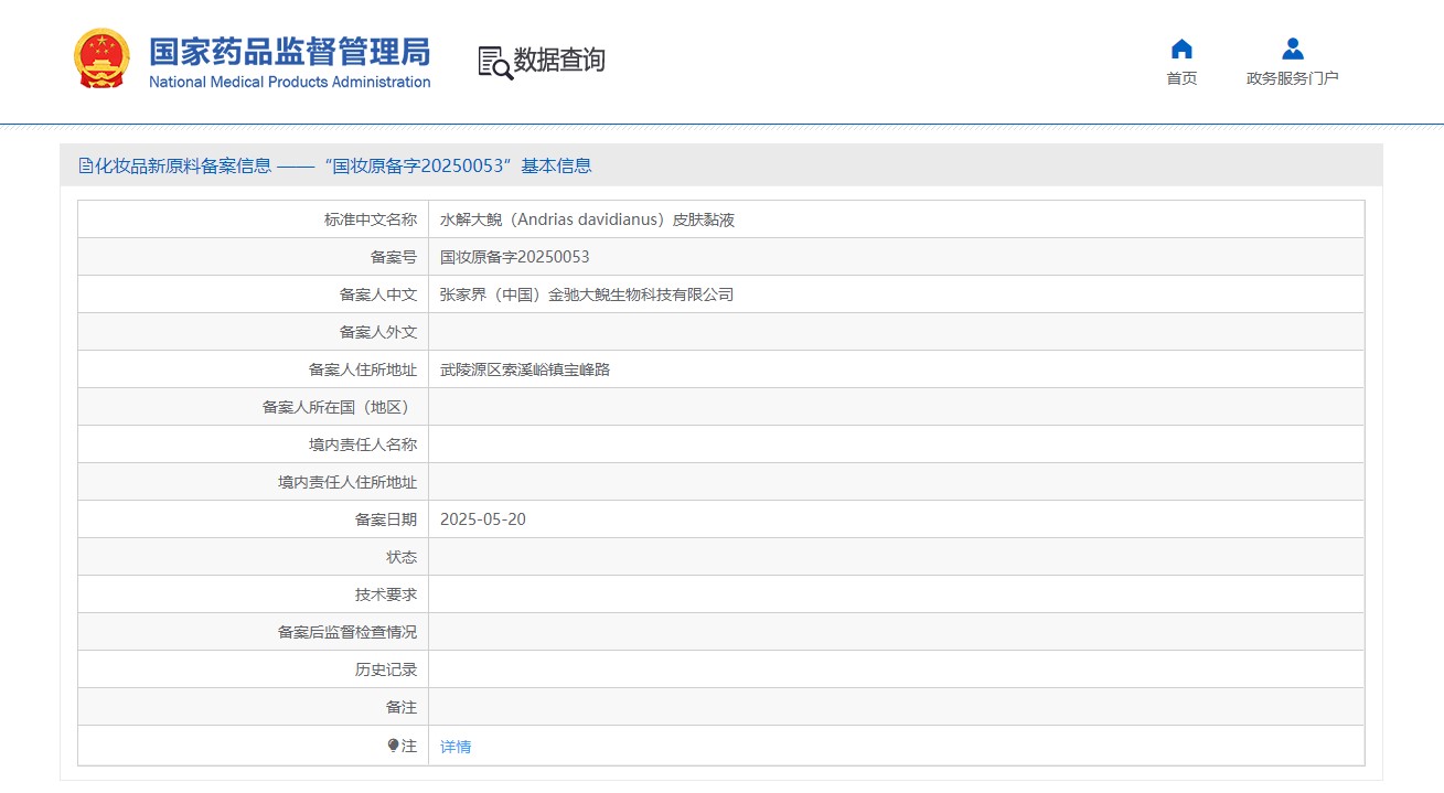 2025年5月20日,国家药品监督管理局化妆品原料备案平台公布,由我院佟长青教授团队主导研发、张家界(中国)金驰大鲵生物科技有限公司申报的“水解大鲵(Andrias davidianus)皮肤黏液”新原料成功通过备案(备案号:国妆原备字20250053)。这是我国首个获批的大鲵来源化妆品新原料,标志着珍稀水生生物资源高值化利用取得突破性进展。