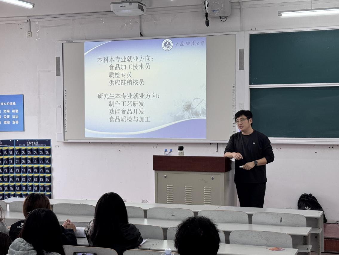 11月12日,我院在獐子岛教学楼231教室举办“食代先锋”讲坛第二期暨大学生职业生涯规划专题讲座。本次讲座邀请大连交通大学教师贾宇盟老师主讲,学院党委副书记武家春、辅导员佟婧绮以及2024级全体本科生共同参与。