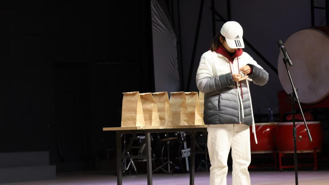 晚会中场迎来欢乐插曲!趣味游戏环节火热开启,参与的观众们踊跃互动、笑声不断,最终抱走香甜酥脆的小饼干奖品,喜悦在现场洋溢。